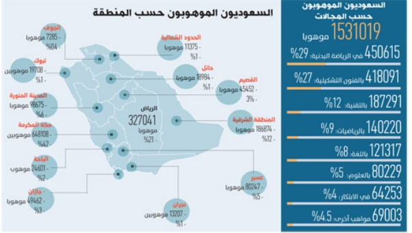 إحصائية حديثة صادرة عن الهيئة العامة للإحصاء أن عدد السعوديين الموهوبين أكثر من 1.5 مليون في مجالات الرياضة البدنية، الفنون التشكيلية، الفنون، اللغة، الابتكار، التقنية، الرياضيات، العلوم، بما يعادل 7.5% من إجمالي السعوديين والبالغ عددهم 20.4 مليون نسمة.