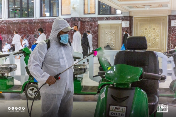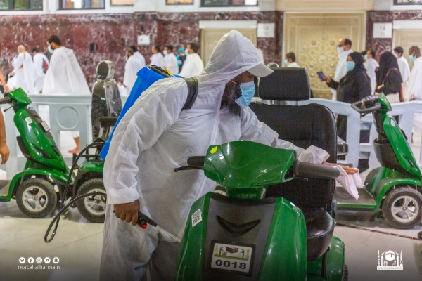 ولفت المقاطي أن عدد العاملين على مباشرة الخدمات لرواد المسجد الحرام بلغ , كأكثر من (١٨٠ ) موظفا مقسمين على أربع ورديات مختلفة يراعى فيها أوقات الذروة لتوفر أقصى معايير الجودة في سرعة العمل والإنجاز فيما يتنوع دور الموظفين ما بين مشرفين وفنيين وإداريين , و أشار إلى أن الإدارة عملت على إقامة ثلاث نقاط لتوزيع العربات في مداخل المسجد الحرام، آخذة في عين الاعتبار اتخاذ كافة الإجراءات الاحترازية لضمان سلامة قاصدي بيت الله العتيق، من وضع ملصقات لتطبيق التباعد الاجتماعي والتأكد من عدم حدوث كثافة بشرية عند الحصول على طلب الخدمة ، كما يتم تطهير العربات الكهربائية المجانية بعد كل مستخدم حرصا منها على اتباع الإجراءات الاحترازية والتدابير الوقائية، والاشتراطات الصحية، ليؤدي ضيوف بيت الله نسكهم بيسر وسهولة.