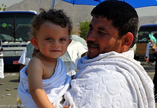 طفل يشارك والده الشعيرة العظيمة