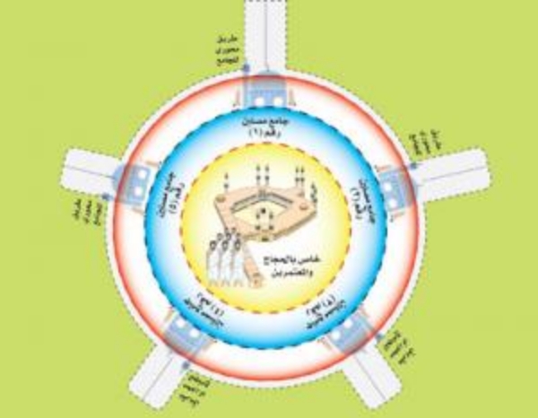 واقترح إنشاءها في مواقع مناسبة على الطرق الدائرية بحيث يسهل الوصول إليها من مختلف المناطق وتبنى بجوارها عمائر كبيرة لإسكان الحجاج والمعتمرين بما يمكنهم من أداء الصلوات الخمس بطريقة مريحة وضمن حدود الحرم ويكون الوصول لمبنى الحرم في المنطقة المركزية لأداء العمرة أو للطواف. وأوضح أن الهدف من ذلك تخفيف الضغط اليومي على الحرم على أن تتم الاستفادة من كامل المساحة المحصورة ضمن الحدود الشرعية للحرم.