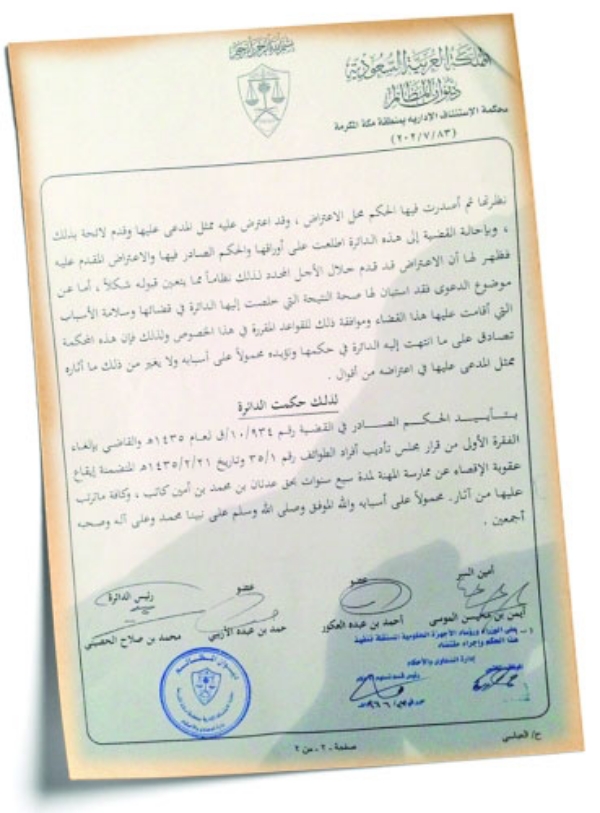 وتأتي تفاصيل الحكم بحسب ما ورد في قرار محكمة الاستئناف، «تحتفظ مكة بنسخة منه»، والذي نص على «إنه قد استبان لمحكمة الاستئناف صحة النتيجة التي خلصت إليها الدائرة في حكمها القضائي، وسلامة الأسباب التي أقامت عليها المحكمة الإدارية هذا القضاء، وموافقة ذلك للقواعد المقررة في هذا الخصوص، ولذلك فإن المحكمة تصادق على ما انتهت إليه الدائرة في حكمها، وتؤيده محمولا على أسبابه، ولا يغير ذلك ما أثاره ممثل المدعى عليها في اعتراضه من أقوال».