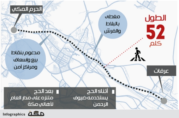 قال مدير عام الحدائق والمرافق البلدية بأمانة العاصمة المقدسة المهندس هشام شلي إن طريق المشاة في عرفات وصل لمرحلته الأخيرة، إذ سيكون أطول طريق للمشاة في العالم، بطول 52 كلم، وسيتم تدشينه قبل حج هذا العام، وكان العمل فيه انطلق منذ سنتين، وحاليا اكتملت مرحلته الأولى والثانية، وتبقت المرحلة الثالثة والأخيرة، وسيتحول من طريق لا يستخدم سوى في الحج إلى متنزه لأهالي مكة طوال العام.