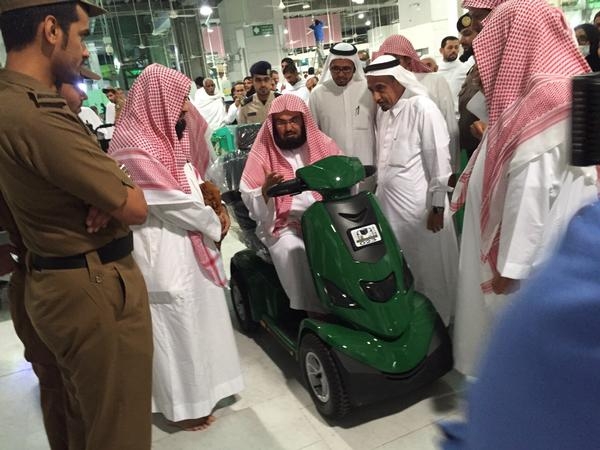 انطلاقاً من حرص واهتمام الرئاسة العامة لشؤون المسجد الحرام والمسجد النبوي لتطوير الخدمات المقدمة لقاصدي الحرمين الشريفين وبما يحقق تطلعات وتوجيهات ولاة الأمر- حفظهم الله - لتوفير كل ما يحقق راحة قاصدي الحرمين الشريفين, دشن معالي الرئيس العام لشؤون المسجد الحرام والمسجد النبوي الشيخ الدكتور عبد الرحمن بن عبدالعزيز السديس العربات الكهربائية الجديدة لذوي الاحتياجات الخاصة وكبار السن ذات المواصفات والمقاييس العالمية, وأوضح مدير إدارة العربات بالمسجد الحرام الأستاذ مصلح بن منير المحمادي أن هذه العربات معتمدة من قبل الهيئة السعودية للمواصفات والمقاييس والجودة وهيئة الدواء والغذاء " كمنتج طبي وتتحمل وزن (250) كجم كحد أقصى".