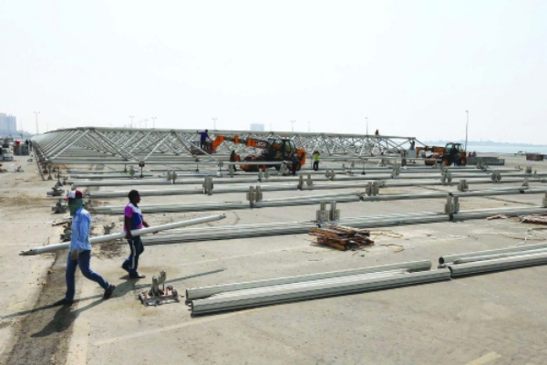 - «البناء الأول الخاص بالفسوحات والتخزين الموقت والتنظيم الإداري قد اكتمل تماما، بينما يجري العمل بوتيرة متسارعة على تركيب المبنى الرئيس للمعرض. انتهى المقاول المنفذ من توريد الهياكل الحديدية التي ستثبت عليها الهناقر، ومن المخطط له أن يتم البناء في غضون شهر أو أقل، بحيث يكون جاهزا في الأسبوع الأول من نوفمبر».