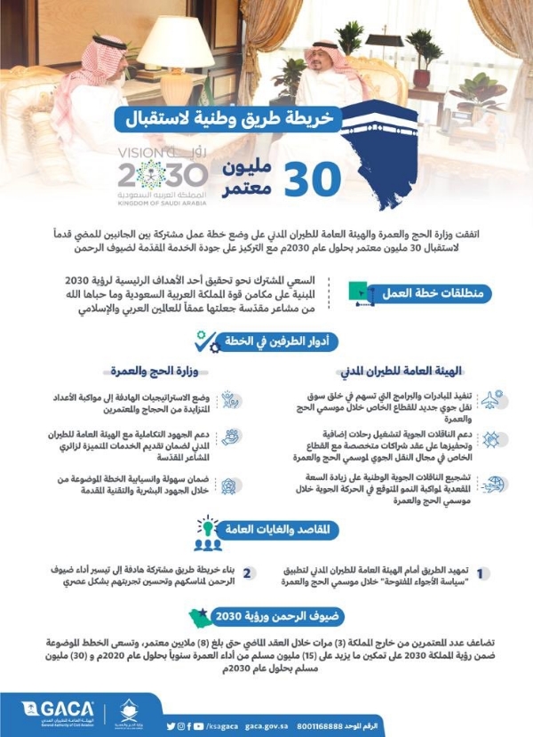 خريطة طريق وطنية لاستقبال 30 مليون معتمر بحلول عام 2030م، وخلق سوق نقل جوّي جديد خلال موسمي #الحج و #العمرة.