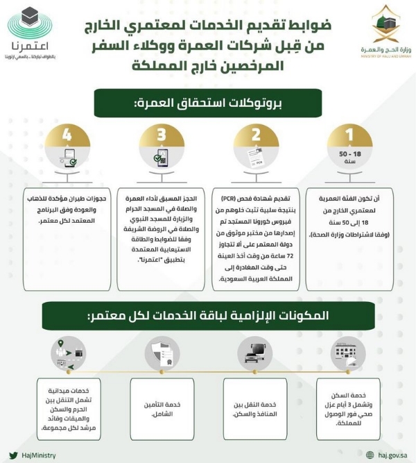 وأوضحت الوزارة أن بروتوكولات استحقاق العمرة تتضمن أن تكون الفئة العمرية لمعتمري الخارج من 18 إلى 50 سنة وفقًا لاشتراطات وزارة الصحة وتقديم شهادة فحص ( PCR) بنتيجة سلبية، تثبت خلوهم من فيروس كورونا المستجد، جرى إصدارها من مختبر موثوق من دولة المعتمر على ألا تتجاوز 72 ساعة من وقت أخذ العينة حتى وقت المغادرة إلى المملكة, والحجز المسبق لأداء العمرة والصلاة في المسجد الحرام والزيارة للمسجد النبوي والصلاة في الروضة الشريفة، وفقًا للضوابط والطاقة الاستيعابية المعتمدة بتطبيق "اعتمرنا" وأن تكون حجوزات الطيران مؤكدة للذهاب والعودة وفق البرنامج المعتمد لكل معتمر.