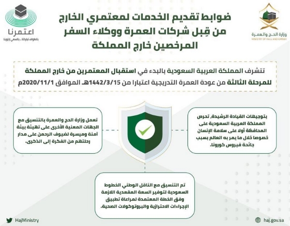 وأكدت الوزارة أن المملكة تتشرف بالبدء في استقبال المعتمرين من خارج المملكة للمرحلة الثالثة من عودة العمرة والزيارة التدريجية اعتبارا من 153 1442هـ الموافق 01 11 2020م, كما تحرص المملكة بتوجيهات القيادة الرشيدة للمحافظة على سلامة الإنسان خصوصًا خلال ما يمر به العالم بسبب جائحة فيروس كورونا.