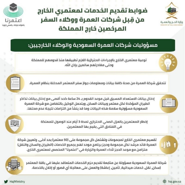 وكشفت أن مسؤوليات شركات العمرة السعودية والوكلاء الخارجيين تختص بتوعية معتمري الخارج بالإجراءات الاحترازية اللازم تطبيقها منذ قدومهم للمملكة وحتى مغادرتهم سالمين بإذن الله, وأن تتحقق شركة العمرة من صحة كافة بيانات ومعلومات جواز سفر المعتمر المدخلة بنظام العمرة، وإدخال بيانات الاستعداد المسبق قبل موعد القدوم بـ 24 ساعة كحد أقصى، مع إدخال بيانات تذاكر الطيران المؤكدة لكل معتمر وبيانات السكن، ويتحمل الوكيل بالتضامن مع شركة العمرة السعودية مسؤولية سلامة هذه البيانات، وما قد ينشأ من التزامات نتيجة عدم صحتها وإخطار المعتمرين بالعزل الصحي الاحترازي لمدة 3 أيام عند الوصول للمملكة في الفنادق التي يقيم بها المعتمرون, وتقسيم معتمري الخارج لمجموعات وتشتمل كل مجموعة على ( 50 معتمراً) بحد أدنى، وتعيين شركة العمرة قائداً مرشداً لكل مجموعة، وحجز برنامج موحد لهم بجميع الخدمات ( الطيران والسكن والنقل ) متزامناً مع موعد الحجز لأداء العمرة والزيارة في " اعتمرنا " المخصص لمعتمري الخارج.