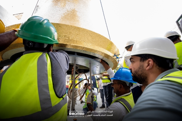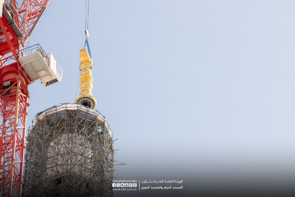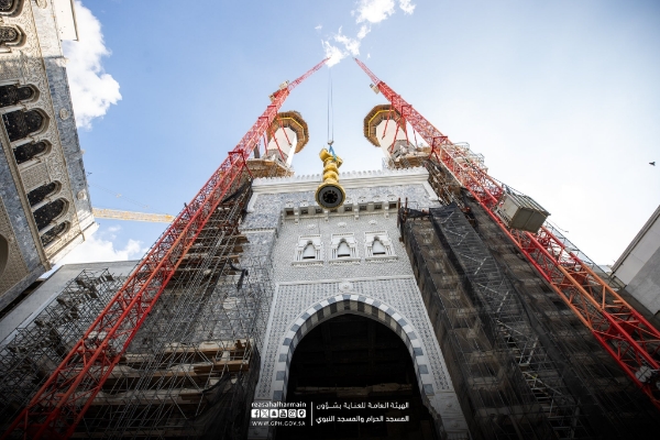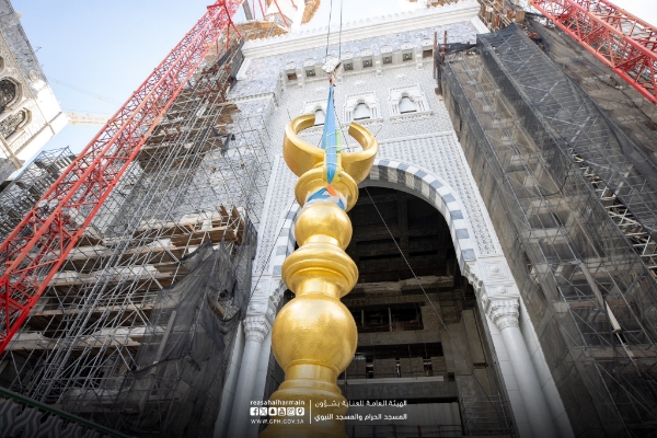 نشر الحسابُ الرسمي للهيئة العامة للعناية بالحرمين، فيديو وصورًا لتركيب آخر هلال من أهلّة المسجد الحرام على منارة باب الفتح.
