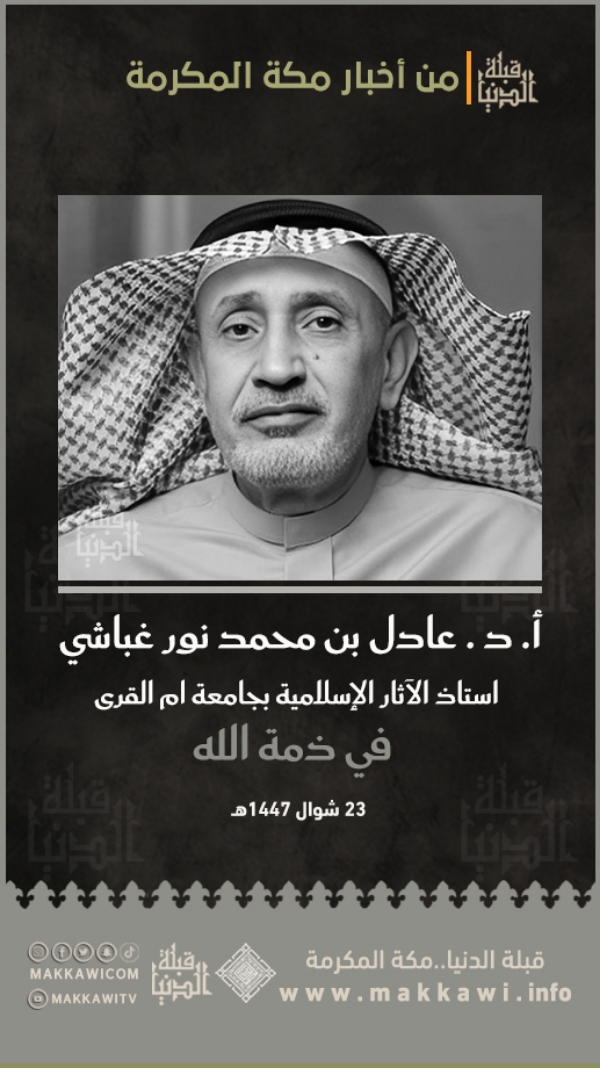 انتقل إلى رحمة الله تعالى يوم السبت 23 شوال 1447هـ الموافق 11 أبريل 2026م، الدكتور عادل محمدنور غباشي، بعد مسيرة حافلة بالعطاء. وقد أُديت الصلاة عليه عقب صلاة العصر في المسجد الحرام، ووُوري جثمانه الثرى في مقابر المعلاة بمكة المكرمة. ويُستقبل العزاء يومي الأحد والاثنين في منزل الفقيد الكائن بحي النزهة.