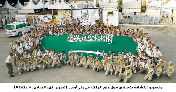 رفرف العلم السعودي أمس في مشعر منى، معلنا توديع الحجيج، وتحلق ثلاثة آلاف كشاف حول العلم ، فيما تعالت هتافاتهم «لبيك يا وطن» لتمتزج مع هتافات تلبية الحجاج «لبيك اللهم لبيك». ورسم فتيان الكشافة صورة أخيرة للعطاء وعشق الوطن، أمام العلم الأخضر الضخم (100 متر مربع) في اليوم الثالث عشر من ذي الحجة، الذي شهد ختام المناسك ونهاية العمل الدؤوب لجمعية الكشافة السعودية. وخلال الموسم، أخذت الجمعية على عاتقها بالتعاون مع وزارة الحج مسؤولية خدمة 232 ألفا و306 حجاج، عبر 23 مركزا منتشرة في المشاعر المقدسة، إذ أرشدوا 49 ألفا و735 حاجا، وأوصلوا 182 ألفا و571 مثلهم، وقادوا 36 طفلا تائها إلى ذويهم.